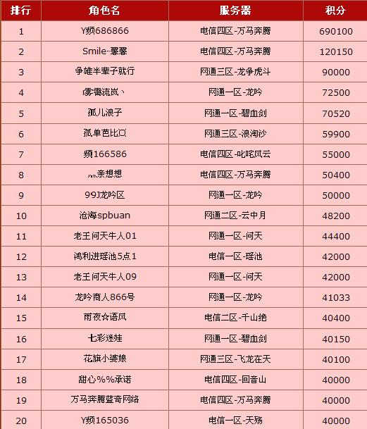新年给力双倍积分大促销火爆进行中!迎新牛人榜和迎新新人榜第一期榜单终于产生啦!向上榜的给力玩家们送上最热烈的祝贺!详情榜单如下: