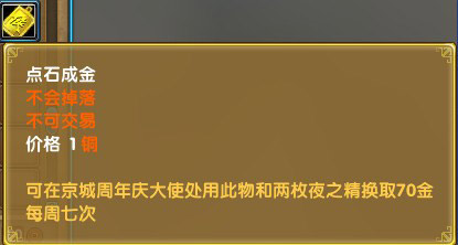 新增“送钱喽”任务可通过每天的活动(修罗逆袭,龙之战争,重铸神兵,杞人补天)获得点石成金牌子一个,在通过一个任务挂一夜任务获得2个夜之精,用这些东西可以在周年庆大使处完成送钱任务获得70金的奖励。(每周7次)