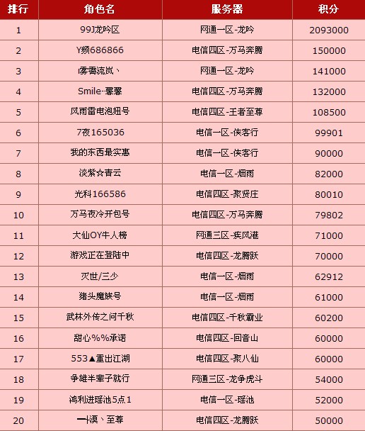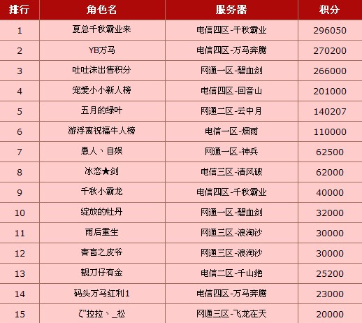 新年给力充值送双倍积分活动最后一期榜单也终于产生啦!牛人榜和新人榜排行榜兑换将于3月29日14时开启!请玩家们届时利用排行榜积分兑换心仪的奖品!向上榜的给力玩家们送上最热烈的祝贺!谢谢各位玩家参与本次活动!最后一期详情榜单如下: